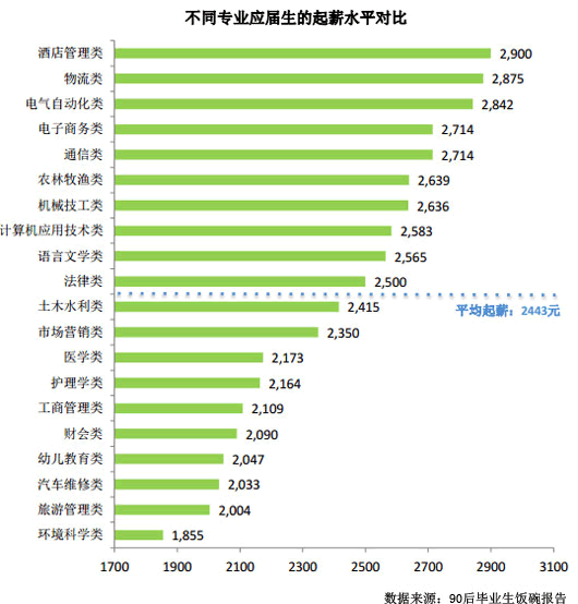 由趕集網(wǎng)和北京大學(xué)發(fā)布的一份名為《90后畢業(yè)生飯碗報(bào)告》的調(diào)查顯示,今年應(yīng)屆畢業(yè)生平均起薪每月2443元,并且有超過(guò)三分之一過(guò)著“啃老”生活。這份報(bào)告數(shù)據(jù)采集方法一是分析網(wǎng)站本身數(shù)據(jù),二是在3.5萬(wàn)份線問(wèn)卷的調(diào)查,所以起薪應(yīng)該是在繳納五險(xiǎn)一金和稅后的到手現(xiàn)金。