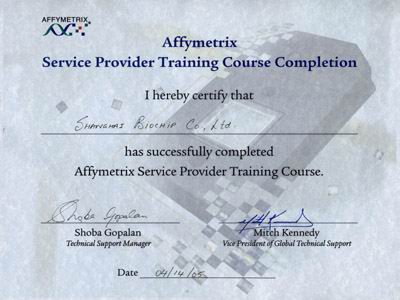2005年4月14日下午2點(diǎn),Affymetrix公司全球技術(shù)支持經(jīng)理Dr.Shoba Gopalan在基因公司的相關(guān)人員的陪同下,到上海生物芯片有限公司就Affymetrix GeneChip技術(shù)服務(wù)的資質(zhì)進(jìn)行了認(rèn)證。上海生物芯片有限公司相關(guān)技術(shù)人員匯報(bào)了Affymetrix GeneChip技術(shù)服務(wù)流程,質(zhì)量控制和數(shù)據(jù)的分析與處理。Dr. Shoba對(duì)上海生物芯片有限公司的Affymetrix GeneChip相關(guān)的工作給予了高度的評(píng)價(jià),文件準(zhǔn)備非常充分,她認(rèn)為是在認(rèn)證中文件準(zhǔn)備得最好的單位之一;技術(shù)力量雄厚,建立了良好的Affymetrix芯片的技術(shù)服務(wù)流程和質(zhì)量控制,在數(shù)據(jù)儲(chǔ)存,分析和數(shù)據(jù)庫(kù)建立等方面做得非常好。完全滿足Affymetrix公司對(duì)技術(shù)服務(wù)的要求,當(dāng)場(chǎng)予以通過認(rèn)證,授予上海生物芯片有限公司通過“Service Provider Training Course”證書。4月29日,Affymetrix公司代表團(tuán)訪問上海生物芯片公司時(shí),將授予正式的認(rèn)證證書。認(rèn)證后Dr. Shoba饒有興趣地參觀了上海生物芯片有限公司的各種生物芯片技術(shù)平臺(tái),大加贊賞。