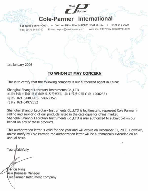 上海上碧實驗儀器有限公司成為美國coleparmer儀器中國地區(qū)總代理,下述文件特此證明: