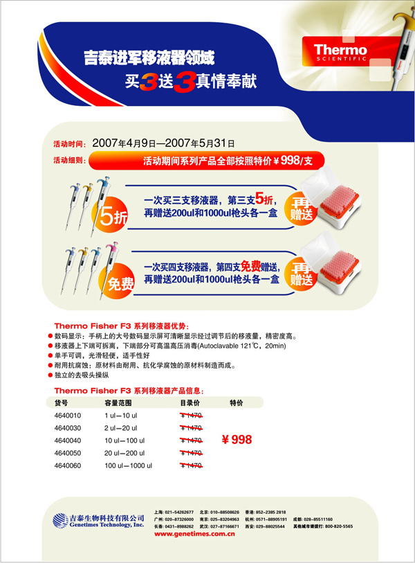 吉泰公司Thermo Fisher F3系列移液器促銷