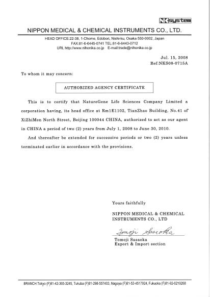 為進(jìn)一步開拓中國市場,日本NK公司與我公司達(dá)成合作協(xié)議,香港自然基因生命科學(xué)有限公司成為日本NK公司全線產(chǎn)品中國區(qū)授權(quán)獨(dú)家總代理。目前,我們的技術(shù)工程師接受了日本NK公司提供的為期7天的售前/售后技術(shù)培訓(xùn),并獲得了廠家頒發(fā)的培訓(xùn)證書。