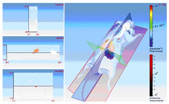 活體動(dòng)物體內(nèi)可見光成像是近年來在全球生物科研領(lǐng)罪蓬勃發(fā)展的一項(xiàng)研究手段,它采用生物發(fā)光和熒光為標(biāo)記物,利用靈敏的儀器來監(jiān)控活體動(dòng)物的細(xì)胞活動(dòng)、蛋白表達(dá)情況和基因行為。而傳統(tǒng)觀點(diǎn)認(rèn)為可見光成像只能提供二維圖像,如果需要三維圖象必須借助CT/SPECT/PET等技術(shù)手段。而二維成像技術(shù)存在無法確定發(fā)光信號位于體內(nèi)的深度,無法準(zhǔn)確定位發(fā)光信號和動(dòng)物器官的直接關(guān)系等問題。美國Xenogen 公司通過自主設(shè)計(jì)開發(fā)的成像設(shè)備以及專門的重建算法,實(shí)現(xiàn)了小動(dòng)物體內(nèi)可見光三維成像。