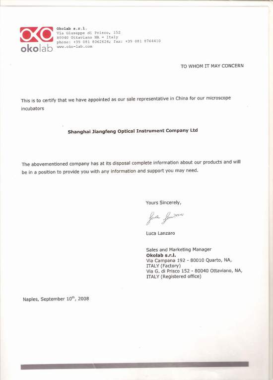 上海江鳳光學(xué)儀器有限公司于2008年9月,成功收到意大利OKOLAB公司的授予函,成為OKOLAB公司在中國地區(qū)的總代理,負(fù)責(zé)OKOLAB公司的產(chǎn)品在中國地區(qū)的推廣,銷售,技術(shù)服務(wù),產(chǎn)品維護(hù)等一系列相關(guān)工作。