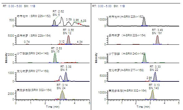 上圖是豬肉樣品中5種β-激動劑LC/MS/MS分析的色譜圖(添加0.1 ppb)。其中,左圖是采用SRM(分辨率 Q1=0.7 amu,Q3=0.7 amu, FWHM)選擇反應(yīng)監(jiān)測功能得到的色譜圖,在譜圖上有明顯干擾峰及較高的背景噪音。右圖是采用H-SRM(分辨率 Q1=0.4 amu,Q3=0.4 amu, FWHM)高選擇反應(yīng)監(jiān)測功能得到的色譜圖,通過提高質(zhì)量分析器的分辨率,增強(qiáng)了離子的選擇性,有效的消除了干擾峰,降低了背景噪音,極大的提高了檢測靈敏度及檢測結(jié)果的可靠性。