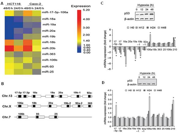 上圖:研究者通過Exiqon miRCURY LNA™芯片檢測發(fā)現(xiàn),細胞在缺氧狀態(tài)下,轉(zhuǎn)錄因子p53可以導(dǎo)致miR-17-92 家族成員的表達下調(diào),并進一步通過實驗證實miR-17-92家族成員很可能就是p53新的下游靶基因。而通過對microRNA的功能實驗分析發(fā)現(xiàn),miR-17-92家族成員表達的下調(diào)可以導(dǎo)致缺氧誘導(dǎo)的凋亡發(fā)生。這些一系列的研究進展,為細胞在缺氧環(huán)境下p53誘導(dǎo)細胞發(fā)生凋亡打開了一條新的信號傳導(dǎo)途徑,其中miR-17-92就起到了p53與細胞凋亡之間的重要聯(lián)系紐帶。Repression of the miR-17-92 cluster by p53 has an important function in hypoxia-induced apoptosis.Yan HL, Xue G, Mei Q, et al.2009. EMBO J.