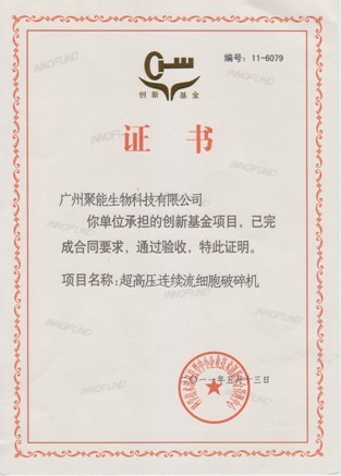 2011年5月,由廣州聚能生物科技有限公司承擔(dān)的“超高壓連續(xù)流細(xì)胞破碎機(jī)”國(guó)家創(chuàng)新基金項(xiàng)目,獲得專(zhuān)家組一致好評(píng),以95.6的高分正式通過(guò)項(xiàng)目驗(yàn)收!俺邏哼B續(xù)流細(xì)胞破碎機(jī)”項(xiàng)目添補(bǔ)了國(guó)內(nèi)空白,各項(xiàng)指標(biāo)達(dá)到了國(guó)際先進(jìn)水平,對(duì)解除生物細(xì)胞破碎瓶頸問(wèn)題具有重大意義。