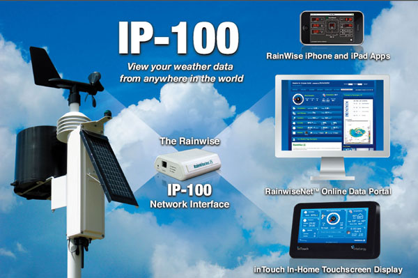 IP-100可以實(shí)現(xiàn)前所未有的多種格式傳輸和輸入。可以通過我們高技術(shù)、免費(fèi)永久觸摸屏顯示器、或者通過Rainwise iPhone 程序來實(shí)現(xiàn)是否在線連接,這樣你就可以隨時(shí)隨地?fù)碛锌捎脷庀髷?shù)據(jù)。