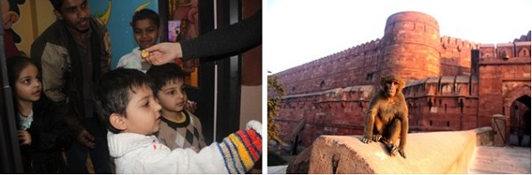 圖:阿格拉酒店中可愛的雙胞胎兄弟(左) 阿格拉古皇城下的美猴王(右)
