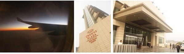 圖:飛機(jī)上看到的日落余暉(左) 展團(tuán)下榻的皇冠假日國際五星級(jí)酒店(中、右)