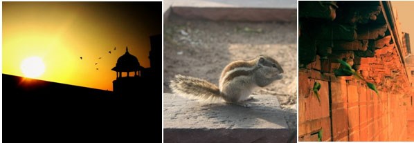 圖:人跡罕至的古皇城,總有飛禽走獸相伴 (左) 城中隨處可見的松鼠 (中)皇城檐下的鸚鵡(右)