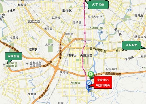 火車北站-會議中心地鐵:1 號線成都火車北站-世紀(jì)城站(C2 出口),步行至?xí)怪行模ú叫袝r(shí)間較長約需要10-15 分鐘);可以選擇地鐵1 號線在省體育館站下,換乘公交504 路在新會展中心北側(cè)站(步行至?xí)䦂?-2 分鐘)。