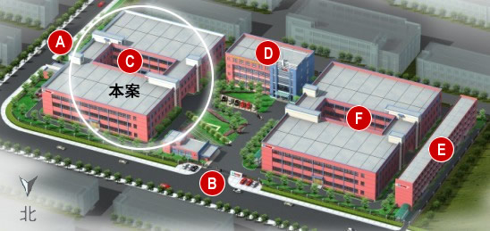 圖示說明: A、本案的獨立出入口; B、雪中炭主入口; C、本案,共三層2棟; D、SMT車間與辦公大樓; E、員工宿舍、食堂與員工服務(wù)區(qū); F、鈑金車間、噴涂車間等。 |