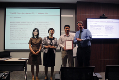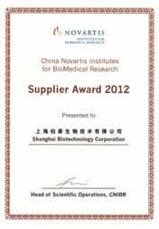 2012年10月16日,諾華(中國)生物醫(yī)學研究有限公司(China Novartis Institutes for BioMedical,CNIBR)向上海伯豪生物技術(shù)有限公司(Shanghai Biotechnology Corporation)頒發(fā)了2012優(yōu)秀供應(yīng)商獎。