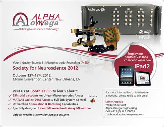 拜譜有限公司與Alpha-Omega公司參加2012年美國“Society for Neuroscience ”期間,中國區(qū)用戶在活動期間10月-12月購置一套多通道腦神經(jīng)電生理實驗系統(tǒng)和微電極陳列定位推進系統(tǒng)贈送一部New iPad 2回饋廣大用戶。
