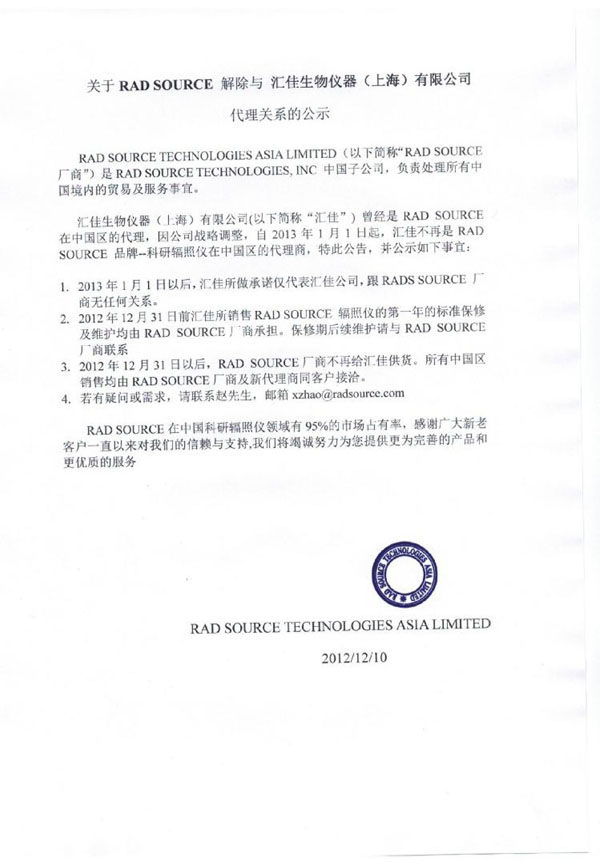 關(guān)于RAD SOURCE 解除與匯佳生物儀器(上海)有限公司