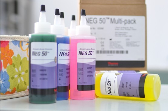 在以往的冰凍切片中大家使用的冰凍包埋劑(OCT)多為無色的,無色的冰凍包埋劑(OCT)經(jīng)過在冰凍切片機上冷凍就成為白色的填充物,它可以滲透入組織間隙起到保護和襯托作用。但是在有些實驗中都用無色包埋劑對應(yīng)不同的樣本難免會產(chǎn)生混淆。THERMO公司現(xiàn)在可以提供六種顏色(蘭,綠,橙,粉,黃和無色)的包埋劑作為選擇,該包埋劑既可以保證在零下50度時仍能有穩(wěn)定高質(zhì)量的冰凍切片,同時也確保染色后沒有任何殘留。