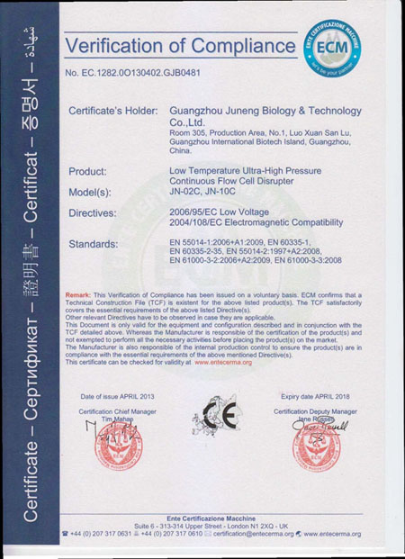 一批國外引進(jìn)回國的科學(xué)家對聚能生物的低溫高壓細(xì)胞破碎機(jī)的綜合使用性能都十分贊賞,并建議應(yīng)該出口到歐美國家,原國家政協(xié)副主席王志珍院士也鼓勵(lì)我們產(chǎn)品應(yīng)該出口,為此我們積極準(zhǔn)備,產(chǎn)品通過了CE認(rèn)證。