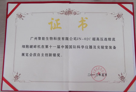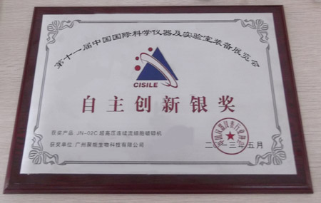在參展第十一屆中國(guó)國(guó)際科學(xué)儀器及實(shí)驗(yàn)室裝備展覽會(huì)期間,由廣州聚能生物科技有限公司自主研發(fā)生產(chǎn)的JN-02C低溫高壓細(xì)胞破碎機(jī)參加CISILE自主創(chuàng)新獎(jiǎng)評(píng)選活動(dòng),經(jīng)過(guò)一系列的評(píng)選程序,JN-02C超高壓連續(xù)流細(xì)胞破碎機(jī)榮獲中國(guó)儀器儀表行業(yè)協(xié)會(huì)頒發(fā)的CISILE自主創(chuàng)新銀獎(jiǎng)。