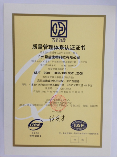 產(chǎn)品質(zhì)量是核心競爭力,產(chǎn)品質(zhì)量是企業(yè)誠信的試金石,經(jīng)本公司全體員工的不懈努力,廣州聚能生物科技有限公司于2013年6月9日獲得了ISO9001:2008質(zhì)量管理體系認(rèn)證證書,證書編號:02813Q10426ROS,認(rèn)證范圍:高壓細(xì)胞破碎機(jī)的研發(fā)、生產(chǎn)及服務(wù)。