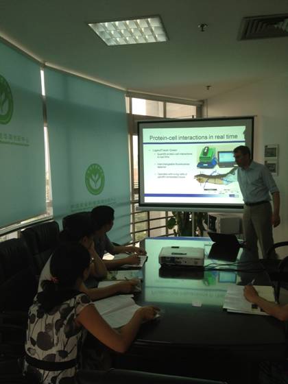 應(yīng)復(fù)旦大學(xué)邀請(qǐng),瑞典Ligand Tracer公司CEO Karl Andersson先生于6月25日拜訪復(fù)旦大學(xué)分子病毒重點(diǎn)實(shí)驗(yàn)室,講解并親自演示了使用Green系統(tǒng)實(shí)時(shí)分析抗體-抗原互做,細(xì)菌-蛋白互做,細(xì)胞-細(xì)胞互做。整個(gè)實(shí)驗(yàn)過(guò)程極其成功,試驗(yàn)結(jié)果具有重要意義,實(shí)時(shí)的數(shù)據(jù)揭示了以前未知的可能的互做模式,得到用戶極大肯定。
