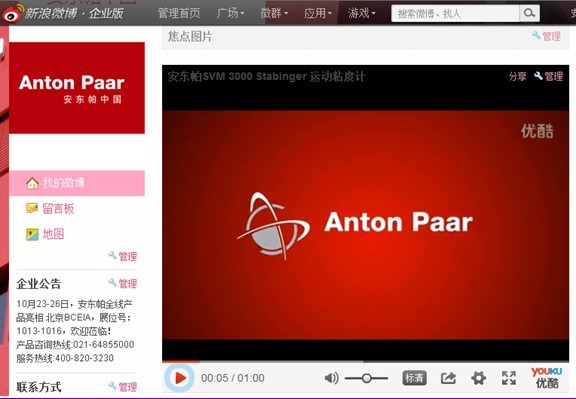 為進一步完善對外宣傳平臺,奧地利安東帕(中國)有限公司于2013年9月1日起正式開通新浪官方微博。我們將更多地與客戶分享產(chǎn)品技術(shù)及應(yīng)用心得,共同關(guān)注和探討行業(yè)發(fā)展趨勢,并為客戶提供快捷、專業(yè)的技術(shù)和商業(yè)支持。官方微博地址:http://e.weibo.com/Antonpaar,敬請關(guān)注。