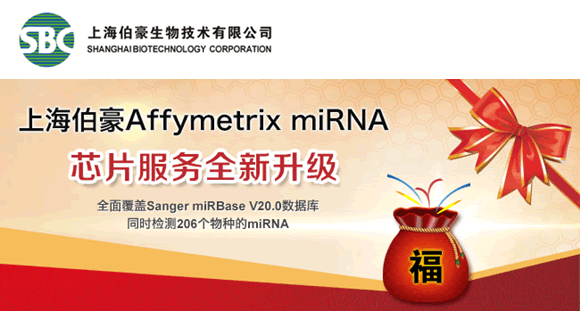 上海伯豪生物技術(shù)有限公司(Shanghai Biotechnology Corporation)作為上海生物芯片有限公司/生物芯片上海國(guó)家工程研究中心旗下的專業(yè)技術(shù)服務(wù)子公司,不斷強(qiáng)化各類生物芯片相關(guān)技術(shù)服務(wù)平臺(tái)建設(shè),為國(guó)內(nèi)外客戶提供專業(yè)化解決方案。在miRNA芯片服務(wù)領(lǐng)域,多年來進(jìn)行了 9000 多份樣品的miRNA芯片檢測(cè)服務(wù),協(xié)助客戶發(fā)表SCI論文50余篇,平均IF4.6。 · 填寫預(yù)訂單:送您“新年福袋”(贈(zèng)送2014年精美臺(tái)歷,限量100份,先到先得)