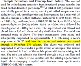 薛華麗副教授在研究中使用Pribolab公司的PriboFast ®M270 多功能凈化柱系統(tǒng)的開展了馬鈴薯中單端孢霉烯族毒素的發(fā)生/代謝和殘留的研究。應(yīng)用PriboFast ®M270 多功能凈化柱進(jìn)行凈化富集馬鈴薯塊莖中的多種單端孢霉烯族毒素A型(T-2毒素和蛇形霉素)和B型(3-乙酰脫氧瓜萎鐮菌醇和鐮刀菌烯酮-X),并使用高效液相色譜-串聯(lián)質(zhì)譜儀,建立了一種可靠、靈敏的可以同時(shí)檢測(cè)多種毒素的方法。該方法線性相關(guān)系數(shù)R≥0.9995,回收率113.28−77.97%,精密度(相對(duì)標(biāo)準(zhǔn)偏差≤5.89),靈敏度(檢出限,0.002−0.005μg/g;定量限,0.005−0.015μg/g)。該方法適用于同時(shí)測(cè)定T-2毒素、蛇形霉素、3-乙酰脫氧瓜萎鐮菌醇和鐮刀菌酮X,這些毒素均由馬鈴薯干腐病菌產(chǎn)生。此外,實(shí)驗(yàn)表明,T-2毒素、蛇形霉素、3-乙酰脫氧瓜萎鐮菌醇和鐮刀菌酮X,主要在存于病變處,而毒素也可以在沒有任何病害癥狀的塊莖中檢測(cè)到。