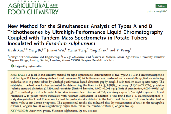 近期,我司客戶甘肅農(nóng)業(yè)大學(xué)理學(xué)院的薛華麗副教授在《Journal of Agricultural and Food Chemistry》上發(fā)表題為: “New Method for the Simultaneous Analysis of Types A and B Trichothecenes by Ultrahigh-Performance Liquid Chromatography Coupled with Tandem Mass Spectrometry in Potato Tubers Inoculated with Fusarium sulphureum”的文章, 影響因子為2.906,該雜志被認(rèn)為是美國(guó)食品界Food Science 方面質(zhì)量最好期刊,為此我司特表示祝賀!