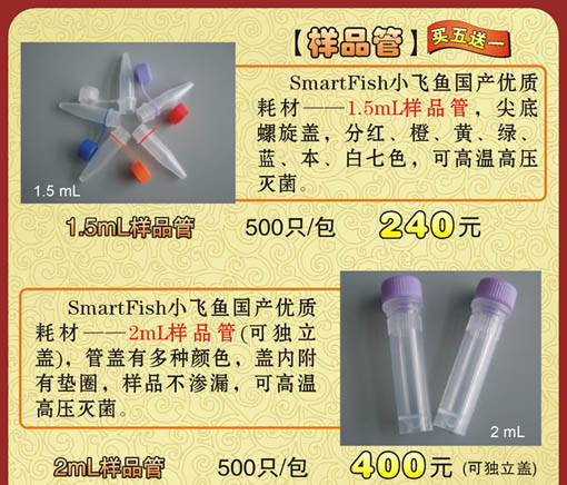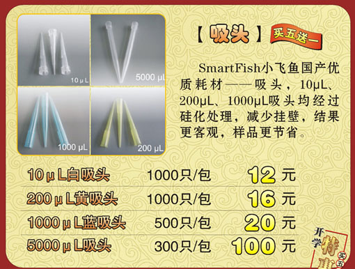 smartFish小飛魚耗材經(jīng)過多年的使用實踐,以其優(yōu)質(zhì)、耐用、高性價比的特點,深受中國農(nóng)業(yè)大學(xué)、北京大學(xué)、清華大學(xué)、中國農(nóng)業(yè)科學(xué)院等等全國各地的科研單位和實驗室喜愛。!