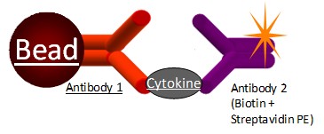 Aimplex流式高通量多因子檢測(cè)基于微球的檢測(cè)法原理,與常規(guī)的夾心法免疫測(cè)定相同。熒光聚苯乙烯微球被抗原特異的抗體包被,已包被抗體的微球混合物與樣本孵育,樣本中的待檢物(如細(xì)胞因子等)與微球上包被的抗體結(jié)合,然后加入生物素標(biāo)記的抗體混合物,與結(jié)合于捕獲抗體(微球)的待檢物特異性結(jié)合。加入Streptavidin-PE,與生物素結(jié)合。用流式細(xì)胞儀(488nm)檢測(cè)熒光,結(jié)合抗原標(biāo)準(zhǔn)品,可實(shí)現(xiàn)對(duì)蛋白抗原的定量檢測(cè)。