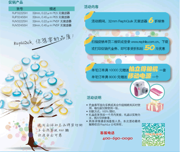 為了更好的回饋廣大用戶的支持,RephiLe從2014年5月起,開始RephiQuik無菌針頭式過濾器大酬賓促銷活動。RephiQuik無菌濾器主要用于生命科學,生物制藥,食品飲料等領域,在組織培養(yǎng)液的配制,血清樣品及緩沖液或其他生物溶液的除菌過濾中廣泛應用。