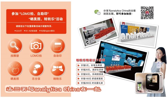用手機記錄您與analytica China雕塑的合影,用我們提供的微信打印機就可以非?旖莸囊訪OMO卡形式打印出來,記錄美好時光,或將圖片分享到朋友圈,向活動工作人員出示后, 可獲得轉轉樂搖獎機會一次。