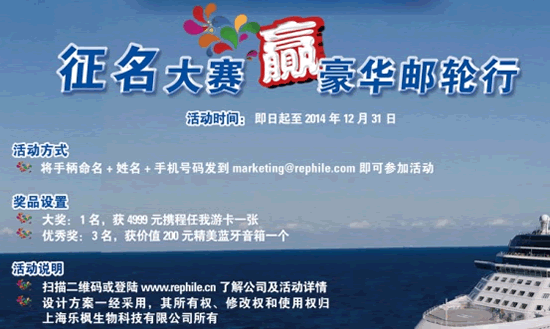 即日起至2014年12月31日,參與者將自己的想法通過電子郵件發(fā)送到marketing@rephile.com即可參加,注意來件務(wù)必注明姓名,以及詳細(xì)的聯(lián)系方式(手機(jī)電話等)。所有設(shè)計(jì)必須原創(chuàng),如設(shè)計(jì)侵犯他人著作權(quán),設(shè)計(jì)者將承擔(dān)所有法律責(zé)任。本次有獎(jiǎng)活動(dòng)設(shè)大獎(jiǎng)一名,產(chǎn)品名稱被采用的命名者將獲得價(jià)值為人民幣4999元的郵輪旅游代金券一張。