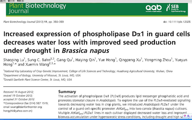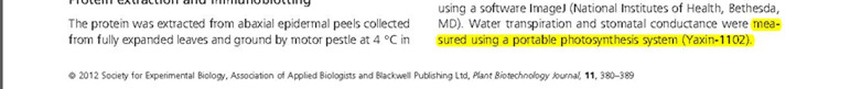 2013年,國(guó)際科研雜志 Plant Biotechnology Journal(2013)11,pp 380-389.發(fā)表了題為 Increased expression of phospholipase Da1 in guard cells decreases water loss with improved seed production under drought in Brassica napus 的研究報(bào)告。該研究報(bào)告中有關(guān)植物葉片氣孔導(dǎo)度(stomatal conductance)和水分傳輸(Water transpiration)兩項(xiàng)測(cè)量所采用的儀器為北京雅欣理儀科技有限公司研發(fā)和制造的Yaxin-1102便攜式光合蒸騰儀(詳見下面網(wǎng)站截圖)。