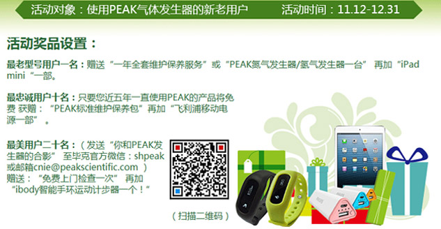 為回饋廣大用戶一直以來(lái)對(duì)PEAK公司的青睞和支持,PEAK公司重磅出擊,推出《尋找老用戶,免費(fèi)贏取氮?dú)?氫氣發(fā)生器》活動(dòng):不僅贈(zèng)送PEAK氫氣/氮?dú)獍l(fā)生器,還有贈(zèng)送“售后年度維護(hù)合同”更有機(jī)會(huì)贏取Ipad mini, 飛利浦移動(dòng)充,ibody運(yùn)動(dòng)智能手環(huán)等好禮。
