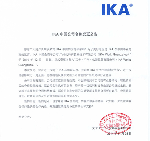 感謝廣大用戶長(zhǎng)期以來(lái)對(duì)IKA 中國(guó)的支持和幫助!為了更好地促進(jìn)IKA在中國(guó)事業(yè)的高效運(yùn)營(yíng),IKA中國(guó)全資子公司“廣州儀科實(shí)驗(yàn)室技術(shù)有限公司(IKA Work Guangzhou)”于2014年12月1日起,正式變更名稱為“艾卡(廣州)儀器設(shè)備有限公司(IKA Works Guangzhou)”。