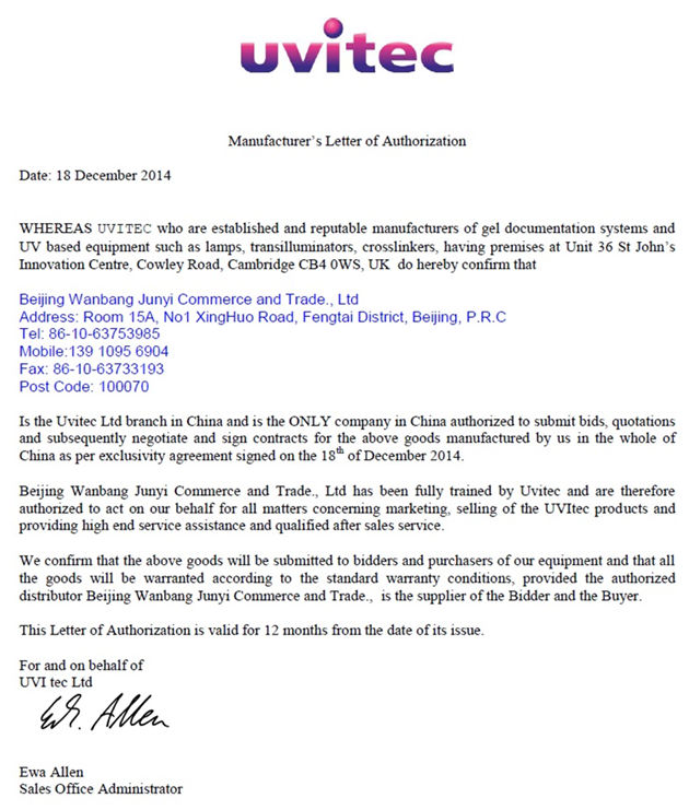 自2015年1月1日起,北京萬邦君意商貿(mào)有限公司為英國UVITEC中國區(qū)獨家代理,英國UVItec Limited將從整體解決方案、產(chǎn)品應用、技術支持、售后服務等各個方面為廣大用戶提供更加專業(yè)、更加快速的服務!