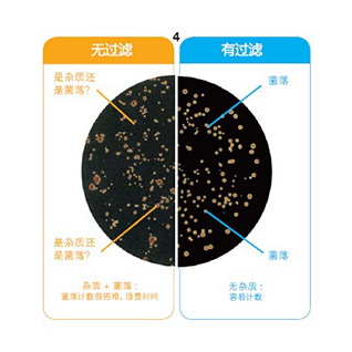 | 樣品均質和過濾在同一時間進行,可快速吸取濾液,無顆粒,無需等待沉淀,無堵塞移液管 | 在均質過程,濾膜阻斷了雜質,濾膜兩側的細菌濃度保持一致,不但增加了精確度,同時加快了計數(shù)速度。 |