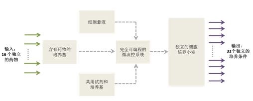 Callisto內(nèi)部集成了維持CO2濃度和溫濕度的裝置,可以支持長期的細(xì)胞培養(yǎng);其完全可編程的微流控系統(tǒng)讓用戶可以根據(jù)研究目的隨意設(shè)置藥物種類、濃度以及處理時(shí)間的組合;系統(tǒng)會(huì)根據(jù)用戶設(shè)定對(duì)每個(gè)培養(yǎng)小室精確的給藥,用戶無需擔(dān)心需要在什么時(shí)候向各個(gè)小室投送多少藥物。目前,Callisto所配備的芯片上具有32個(gè)獨(dú)立的細(xì)胞培養(yǎng)小室,一次可以篩選32個(gè)不同的培養(yǎng)條件;細(xì)胞培養(yǎng)和給藥過程全部由程序控制自主完成,基本實(shí)現(xiàn)整個(gè)流程的自動(dòng)化。研究者只需要設(shè)定好程序,加入細(xì)胞和藥物,按下按鈕就可以運(yùn)行了。與傳統(tǒng)細(xì)胞培養(yǎng)方式相比,不但使操作流程變得簡單,也最大限度減少了觀察、換液、加藥過程中人為操作對(duì)細(xì)胞的擾動(dòng)(例如:溫度變化、液流沖擊、微生物污染等)。