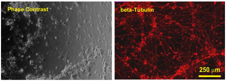 圖三、芯片小室中誘導(dǎo)人IPS細(xì)胞向神經(jīng)細(xì)胞分化。相差(左)及免疫熒光圖(右)可以觀察其形態(tài)。