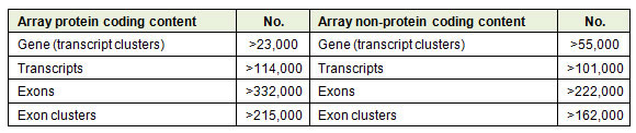 3. 每個外顯子約有10條探針,每個外顯子-外顯子剪接位點有4條探針。該分析可產(chǎn)生最全面、準確和可再現(xiàn)的全轉(zhuǎn)錄組表達數(shù)據(jù),并可靈活地選擇所需的分析水平來解答您的生物學問題-包括基因水平、轉(zhuǎn)錄本水平、蛋白編碼或非編碼RNA水平。