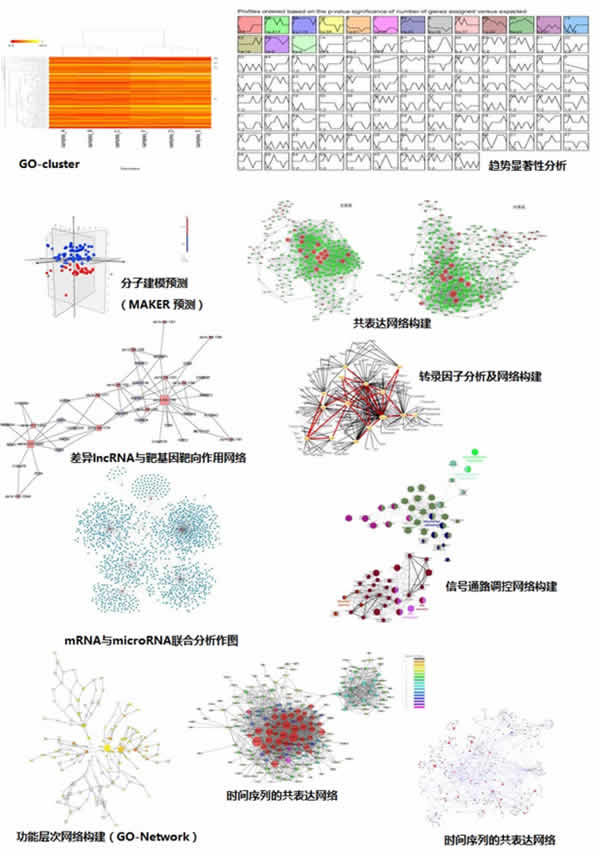 高級分析內(nèi)容:功能層次網(wǎng)絡(luò)構(gòu)建(GO-Network)、GO Cluster、信號通路調(diào)控網(wǎng)絡(luò)構(gòu)建(Pathway-Network)、基因相互作用網(wǎng)絡(luò)圖、轉(zhuǎn)錄因子分析及網(wǎng)絡(luò)構(gòu)建、共表達網(wǎng)絡(luò)構(gòu)建(Coexpression Network)、時間序列的共表達網(wǎng)絡(luò)、分子建模預測(MAKER 預測)、可變剪切分析、mRNA與miRNA聯(lián)合分析、mRNA與lncRNA聯(lián)合分析