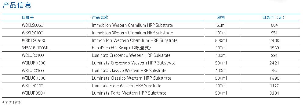 Immobilon® HRP化學(xué)發(fā)光底物,其靈敏度達(dá)到fg級(jí),而低廉的價(jià)格以及極為穩(wěn)定的品質(zhì)使其成為市售同類產(chǎn)品中性價(jià)比最高的。Immobilon® HRP使您的Western Blotting成功率有了堅(jiān)實(shí)的保障。 選用靈敏度更高的HRP底物獲得更好的數(shù)據(jù),同時(shí)帶來三重效益: ——更佳的結(jié)果:產(chǎn)生更強(qiáng)的條帶信號(hào)便于進(jìn)行定量印跡檢測(cè)(例如,比較同為1:10,000稀釋度時(shí)Luminata™ Crescendo和Forte底物所獲得的不同條帶強(qiáng)度) 較晚上市的Luminata™系列將ECL兩種反應(yīng)液合二為一,使用更為簡(jiǎn)便,減少人為錯(cuò)誤操作可能帶來的損失,數(shù)據(jù)更穩(wěn)定。Luminata™系列HRP底物按靈敏度分為三種: 默克密理博春季促銷活動(dòng)開始啦! ——凡購(gòu)買500mL包裝HRP底物即可獲得精制多用途收納盒1個(gè),多買多贈(zèng) 詳情請(qǐng)垂詢您的默克密理博銷售專員,立即訂購(gòu)>> 鏈接:同期WB相關(guān)活動(dòng)