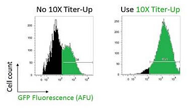 Flow cytometry data shows higher transduction efficiency (higher titer) of GFP retrovirus packaged using Retrovirus 10X Titer-Up