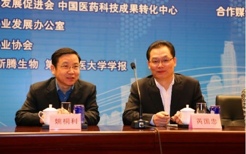 中國醫(yī)藥企業(yè)發(fā)展促進(jìn)會(huì)副會(huì)長(zhǎng) 姚桐利(左)、中國醫(yī)藥科技成果轉(zhuǎn)化中心主任 芮國忠(右)