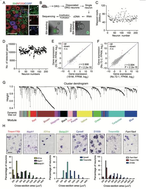 研究人員首先利用融合IB4的CGRP,NF200熒光標記物對神經(jīng)元進行免疫染色(Immunostaining)。結(jié)果表明,~35%的神經(jīng)元能被IB4染色,~41.2%被CGRP染色,~46.4%被NF200染色(圖1A)。大約20%被IB4染色的神經(jīng)元能夠表達CGRP,然而只有5.6%表達NF200。大約28%被CGRP染色的神經(jīng)元表達NF200。極少數(shù)可以同時被三個染色。為了提高對神經(jīng)元細胞分類的效率,研究人員設(shè)計了一個專門針對DRG分類的方法。首先,DRG細胞被從小鼠體內(nèi)分離出后再利用IB4對其染色(圖1B)。顯微鏡下,那些周圍沒有衛(wèi)星細胞的被選擇用來進行轉(zhuǎn)錄組測序。測序文庫一共來源于19個小鼠的203個神經(jīng)元。