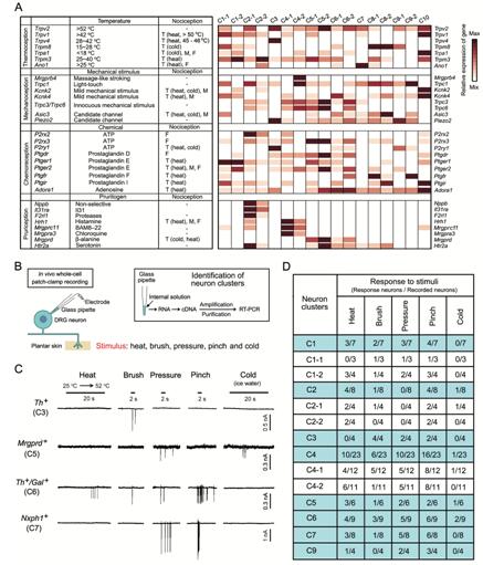 一個合格的標志基因的先決條件需要具備可選擇性,高表達以及可實驗性。Gal,Nppb,Th以及Mrgpra3被認為是C1,C2,C3和C4的標志物(圖4A)。每個簇可以有多個標志物,如Nts,Il31ra以及Htr1f同時作為C2的標志物(圖4B),Cadps2,Baiap2l1和Necab2同時作為C9的標志物(圖4C)等等。原位雜交實驗確認了該結(jié)果的準確性(圖4F,G)。