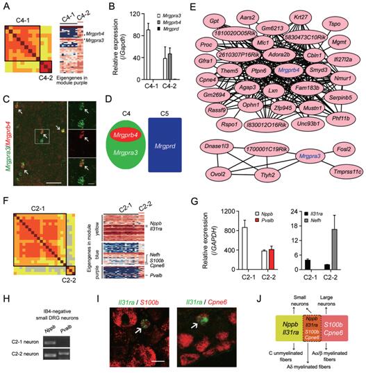 根據(jù)簇的分類,C1,C2,C4,C5,C,C8以及C9還可以被分為兩個亞簇,總共14個亞簇(圖2A,3A)。以C4為例,C401表達Mrgpra3基因,而C4-2同時表達Mrgpra3基因與Mrgprb4基因。單細胞定量PCR以及原位雜交實驗同樣確認了C4-2的存在(圖3B-D)。Mrgpra3基因與Mrgprb4基因盡管同在C4-2中被檢測到,但共表達網(wǎng)絡(luò)卻沒有任何交集(圖3E)。