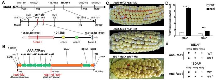 2. Rea1的圖位克隆及等位測試dek*基因被定位在第六號染色體大約101.6kb范圍內(nèi)。在候選基因1中只有一個單個的核苷酸多態(tài)導(dǎo)致一個氨基酸的改變。等位測試確認了ZeRea1就是dek*基因。定量PCR與 Western雜交實驗確認了ZeRea1在突變體籽粒中表達量的下降。