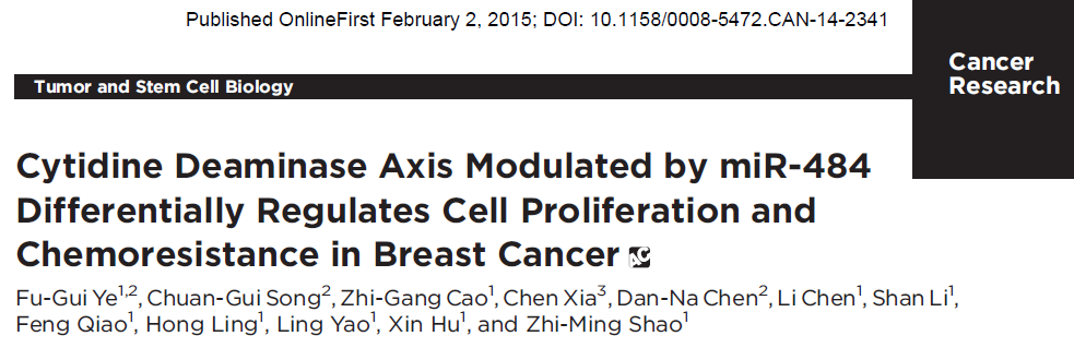 Fu-Gui Ye,Chuan-Gui Song, Zhi-Gang Cao,Chen Xia, Dan-Na Chen, Li Chen, ShanLi, Feng Qiao, Hong Ling, Ling Yao, Xin Hu, and Zhi-Ming Shao. Cytidine Deaminase Axis Modulated by miR-484 Differentially Regulates Cell Proliferation and Chemoresistance in Breast Cancer. Cancer research 2015, 75, 1504-15.